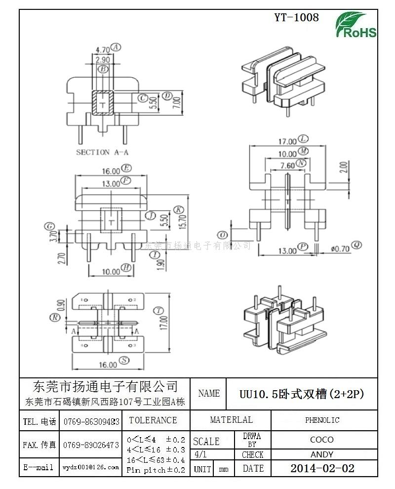 UU10.5变压器骨架UU10.5电木骨架UU10.5高频骨架 卧式双槽2+2P YT-1008