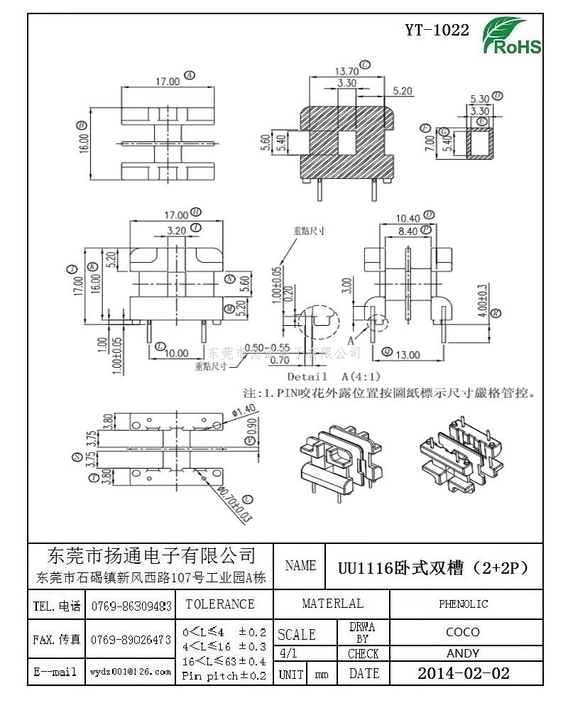 UU1116变压器骨架UU1116电木骨架UU1116高频骨架 卧式双槽2+2P YT-1022