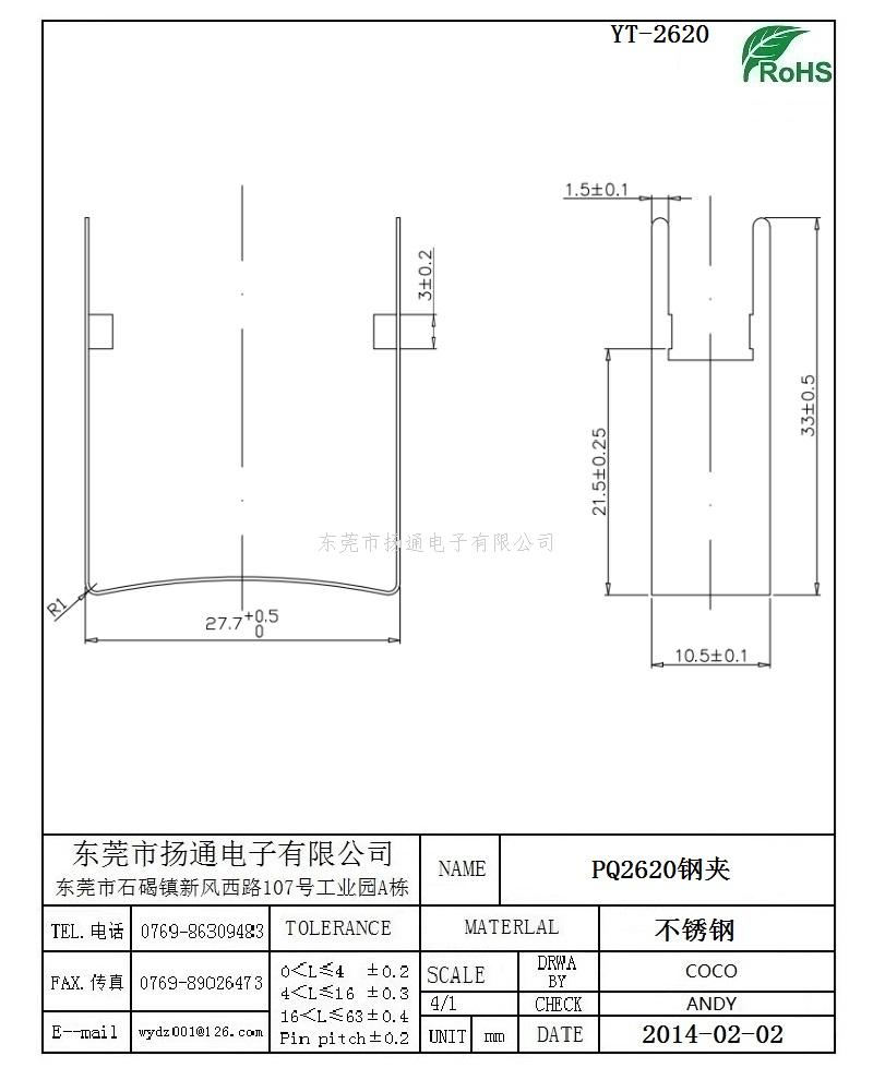 PQ2620变压器钢夹 Clip卡子 YT-2620