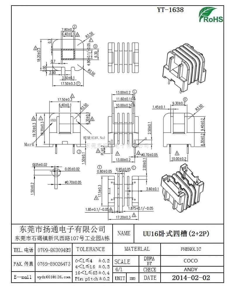 UU16变压器骨架UU16电木骨架UU16高频骨架 卧式四槽2+2P YT-1638
