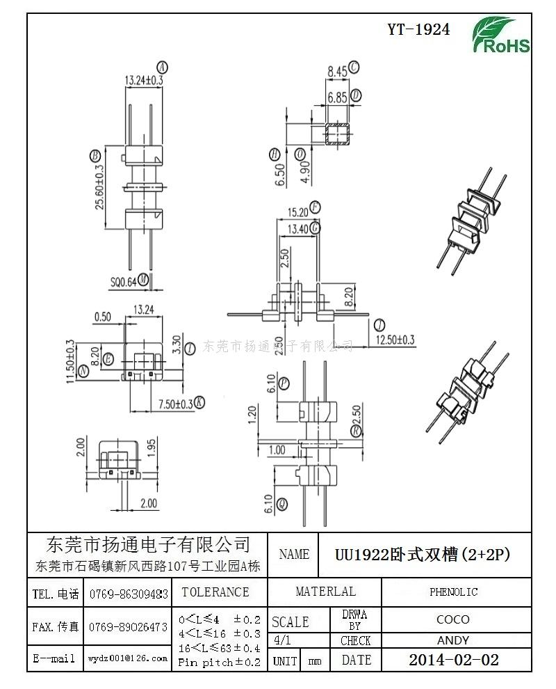 UU1922变压器骨架UU1922高频骨架UU1922电木骨架 卧式双槽2+2P YT-1924