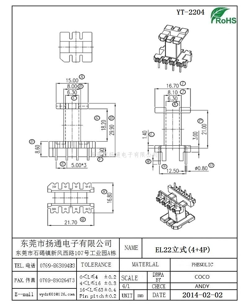 EL22电木骨架EL22高频骨架 立式4+4P YT-2204